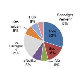 Ein besonderes Augenmerk sollte dabei auch auf den Graf-von-Galen-Ring gerichtet werden, da hier der Grenzwert mit 39 µg/m3 nur denkbar knapp eingehalten wird. Hierfür ist auch der verhältnismäßig hohe ÖPNV-Anteil am Gesamtverkehrskommen verantwortlich, wie die Verursacheranalyse des Luftreinhalteplans Hagen 2020 zeigt. So leisten am Graf-von-Galen-Ring die Busse mit 16 %, nach den PKW (30%), den zweithöchsten Beitrag aus der Gruppe des lokalen Kfz-Verkehrs (s. Abb. 3).