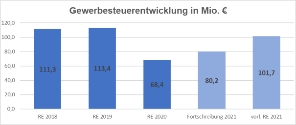 Der Haushaltsansatz aus der Fortschreibung für das Jahr 2021 beträgt 80,2 Mio. €. Auch im abgelaufenen Jahr 2021 verharren die Gewerbesteuereinnahmen – trotz Erholung ggü. dem Jahr 2020 – coronabedingt auf niedrigerem Niveau im Vergleich zu den Jahren 2018 und 2019. Das vorläufige Ergebnis 2021 beläuft sich auf ca. 101,7 Mio. €. Hierdurch wird sich voraussichtlich im Jahresabschluss ergebnisneutral der prognostizierte coronabedingte Schaden minimieren.