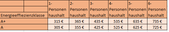 Liegt ein Energiebedarfsausweis vor, kann ein Klimabonus gewährt werden, außer in den Fällen, in denen die Nettomiete und/oder die (kalten) Betriebskosten bereits angemessen sind. Voraussetzung ist, dass das Gebäude lt. Energiebedarfsausweis einer der in der nachstehenden Tabelle aufgeführten Energieeffizienzklassen zugeordnet ist.
