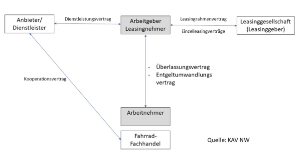 Regelmäßig findet bei der Umsetzung des TV-Fahrradleasing eine mehrseitige Vertragskonstruktion Anwendung, die über einen Anbieter/ Fahrradleasingdienstleister abgewickelt wird. Zur Verdeutlichung dient folgendes Schaubild: