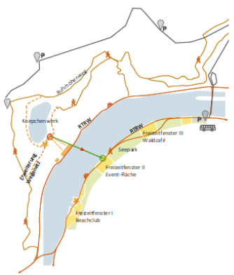 Begreift man das Projekt nicht als singuläre Anlage, sondern als „Netzwerkknoten“ oder „Puzzlestück“, dann entsteht ein neues raumgreifendes Bild: ein Gefüge, in dem die bestehenden Einzelteile neu profiliert, aufgewertet und zusammengebunden werden können. Sicherlich stellt der Zip-Line-Flug bereits eine außergewöhnliche Attraktion dar. Doch erst aus der Verbindung mit dem neuen SeePark, dem SeeBad, der bildungspädagogischen Integration des Koepchenwerks, den vielfältigen Naherholungsoptionen und der Einbindung in ein überregionales Wander- und Radtourennetz durch Ruhrhöhenweg und Ruhrtalradweg, entsteht eine ganz neue touristische Destination am Hengsteysee“ [vgl.  Machbarkeitsuntersuchung Panorama Zip-Line, 2023, S. 19, Schramm+Partner].
