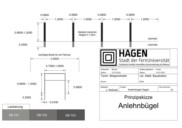 Abstellanlagen sind in Ihrer Nutzbarkeit, Handhabung, der gestalterischen Kompatibilität sowie der Preisgestaltung sinnvoll auszuwählen. In frequentierten Bereichen, in denen das Fahrrad für einige Minuten bis zu mehreren Stunden abgestellt wird, eignet sich ein Anlehnbügel als ideale Abstellanlage, die sich in den öffentlichen Raum platzsparend einfügt. Zur Gewährleistung der Nutzbarkeit wird sich für ein Flachstahl-Modell entschieden, welches über einen Querholm verfügt, sodass möglichst jede Art von Fahrrad sicher angeschlossen werden kann. Diese Kriterien erfüllt der Anlehnbügel „UTAH“ der Firma Ziegler, der bereits im Innenstadtbereich installiert wurde. Um eine Stringenz in der Nutzbarkeit sowie gestalterischen Kompatibilität zu schaffen, wird sich auf ein solches oder ähnliches Modell des genannten oder eines anderen Herstellers bezogen. Die Anlehnbügel sollen in der Farbe DB 703 (dunkelgrau/anthrazit) lackiert werden, um den Vandalismus möglichst einzudämmen, da gerade hellere Farbtöne deutlich an- und auffälliger sind. Des Weiteren fügt sich ein Anlehnbügel in dieser Lackierung in das bestehende Stadtbild ein.