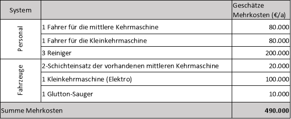Zur Erbringung der 14-maligen Reinigungsleistung in der Woche mit entsprechender Umstellung auf einen Zwei-Schicht-Betrieb ist laut der HEB GmbH eine weitere Kleinkehrmaschine inkl. Fahrer*in notwendig. Die vorhandene mittelgroße Kehrmaschine reicht aus und muss nicht neu beschafft werden, für den Zwei-Schicht-Einsatz wird hierfür jedoch ein/e weitere/r Fahrer*in benötigt. Des Weiteren ist die Beschaffung eines weiteren Glutton-Saugers notwendig.