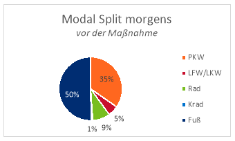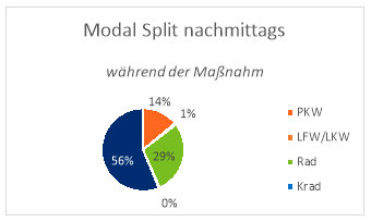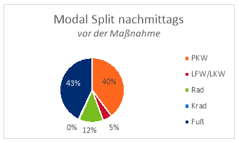 Das Verkehrsaufkommen nachmittags ist bei der Untersuchung vor und während der Maßnahme höher als in den Morgenstunden. Zur Visualisierung wird ein Modal Split, also eine Verteilung der Verkehrsmittel nach Verkehrsaufkommen erstellt.