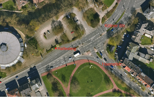 Aufgrund der aus verkehrlicher Perspektive besonderen Lage des Haltesteigs Niederhaspe (stadtauswärts) spricht sich die Verwaltung jedoch erneut für die Beibehaltung der dortigen Busbucht aus. Der Haltesteig schließt unmittelbar an einen Kreuzungspunkt mit hoher Verkehrsbelastung an (Kreuzung Kölner Str./Haenelstr., s. Abbildung 1). Sowohl von der Kölner Str. als auch von der Haenelstr. aus kommt es zu einem starken Zufluss, weshalb bei einem Rückbau der vorhandenen Busbucht mit einem Rückstau in den Kreuzungsbereich zu rechnen ist. Wie bereits in der Vorlage mit der Drucksachennummer 0576/2024 dargelegt, liegt der Haltesteig in einem Bereich mit einer insgesamt als hoch zu bewertenden Verkehrsbelastung.