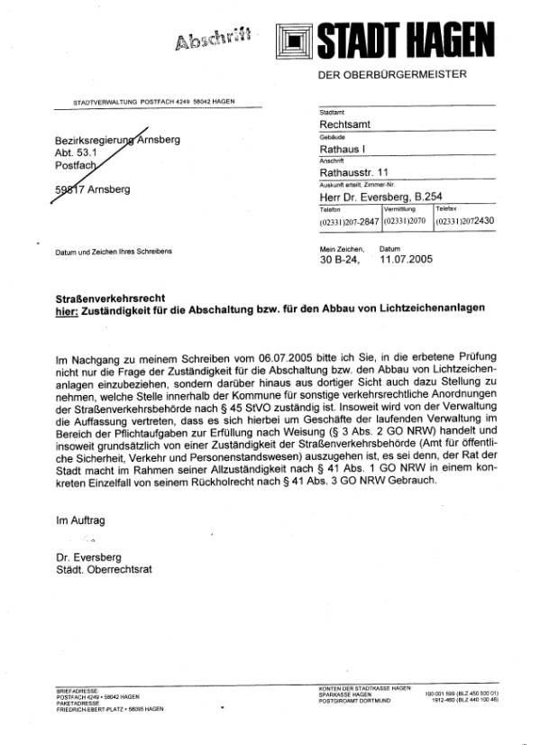 Abschaltung von Lichtsignalanlagenhier: Dringlichkeitsbeschluss der BV Haspe, bestätigt durch Beschluss der BV Haspe vom 07.06.2006