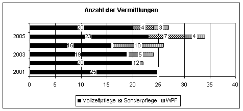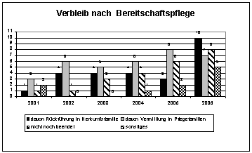 6 Kinder wurden mit Jahreswechsel in das Jahr 2006 übernommen, 24 weitere Kinder wurden neu aufgenommen. Aus der Bereitschaftspflege wurden 10 Kinder in den elterlichen Haushalt zurückgeführt, 7 Kinder in andere Pflegefamilien vermittelt. Von den 5 sonstigen Beendigungen wechselte 1 Kind in eine Adoption, 1 Kind in eine Mutter-Kind-Einrichtung, 1 Kind in ein Heim und 2 Kinder in die Zuständigkeit eines anderen Jugendamtes. Zum Jahresende befanden sich noch 8 Kinder in Bereitschaftspflege.