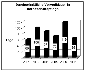 Das angestrebte Ausbauziel von 8 Bereitschaftspflegestellen für Kinder von 0 – 6 Jahren wurde in 2006 erreicht. Für Kinder von 6 – 10 Jahren konnten 2 der geplanten 4 Bereitschaftspflegestellen eingerichtet werden. Durch den Wechsel in Dauerpflege oder durch Beendigung haben 3 Pflegefamilien diese Tätigkeit in 2006 aufgegeben, und 4 neue Pflegefamilien wurden gefunden. Im Jahresmittel standen damit 9,25 Bereitschaftspflegefamilien zur Verfügung.