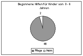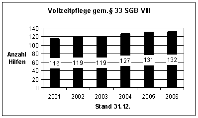 In 2006 konnte durch den Ausbau der Bereitschafts- und Sonderpflege das Ziel “Kein Kind unter 6 Jahren im Heim” zu 96 % erreicht werden. Von 25  Inobhutnahmen  und 23 begonnenen Hilfen zur Erziehung  außerhalb des Elternhauses  wurden nur 2 Kinder an insgesamt 214 Betreuungstagen im Heim untergebracht. 46 begonnene Inobhutnahmen und Hilfen zur Erziehung mit insgesamt 3963 Betreuungstagen wurden in Pflegefamilien geleistet.