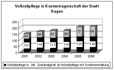 Um die Entwicklung der Vollzeitpflegen im Rahmen der Hilfen zur Erziehung verzerrungsfrei abzubilden, sind Pflegeverhältnisse einzubeziehen, für die die Stadt Hagen letztendlich kostenverantwortlich ist. Die Gesamtzahl dieser Vollzeitpflegen gibt die eigentliche Entwicklung der Vollzeitpflege im Vergleich zur Heimerziehung wieder.   Hier zeigt sich ein konstanter Anstieg der Vollzeitpflegen in Kostenträgerschaft der Stadt Hagen. In den letzten 6 Jahren stieg diese Zahl der Pflegekinder von 149 auf 208 Fälle an. Seit Ausbau des Fachdienstes für Pflegekinder im Jahr 2005  hat sich die Anzahl von 174 Pflegekindern um 34 Pflegefälle gesteigert. Hier zeigt sich die hohe Vermittlungsintensität des Fachdienstes auch über Hagens Stadtgrenzen hinweg. Ohne geeignete Vermittlung in Vollzeitpflege bliebe für viele Kinder nur die Betreuung in entsprechenden Heimeinrichtungen.