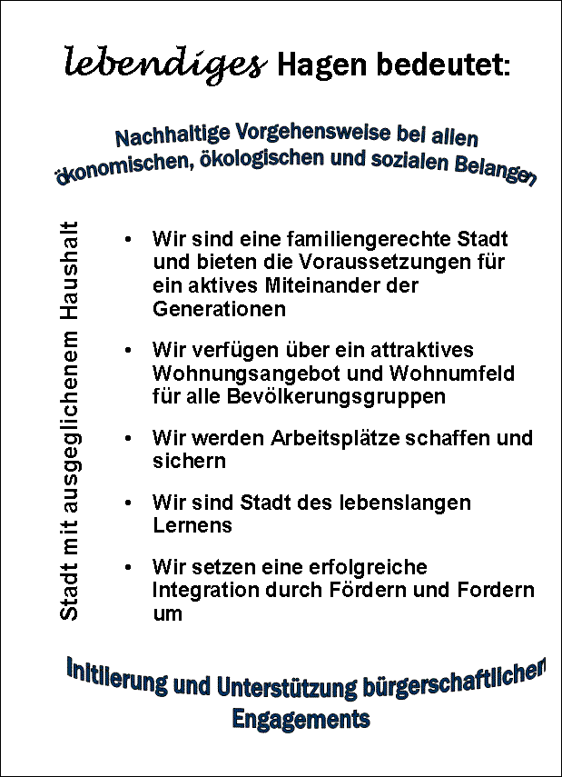 Der Rat der Stadt beschließt das Leitbild „Lebendiges Hagen“ mit den in der Vorlage beschriebenen strategischen Handlungsfeldern und erklärt es zur Grundlage des künftigen Handelns.